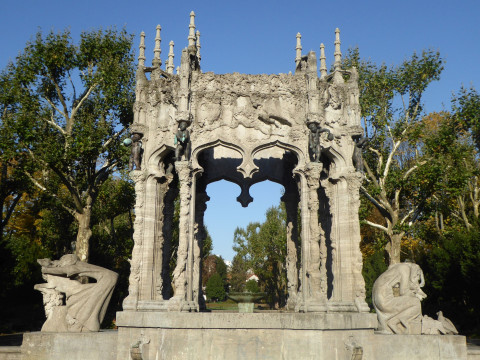 Der Brunnen besitzt ein großes Becken, in das eine hohe, baldachinartige Architektur über einem Sockel eingestellt ist. Die Pfeiler- oder Säulenarchitektur stellt in symbolistisch stilisierter Form bewachsene und von Vögeln, Fröschen und Eidechsen bevölkerte Baumstämme dar. Die geschweiften Wandfelder zwischen den Pfeilern zeigen figürliche Reliefszenen: Reihervögel mit ihren Beutetieren, Adler und Eule als Symbole für Tag und Nacht sowie Darstellungen von Mond, Sternen und Sonne.