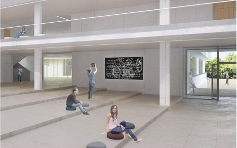 Unterschiedliche Formen der Handschrift, die im Unterricht auf den digitalen Tafeln entstehen, werden auf einem zentralen Monitor im Foyer zusammengeführt. Die Videosequenz zeigt verschiedene Tafelbilder in sich abwechselnden Überlagerungen –kontinuierlicher Fluss von Schulzeichnungen, der sich im Idealfall über den ganzen Tag erstreckt, ohne sich zu wiederholen. So entstehen vielschichtige Palimpseste des Wissens, die erst durch genaueres Hinsehen entzifferbar werden. Darin ähnelt das Tafelbild dem wissenschaftlichen Werk Leonardos, der seine universalen Studien zumeist in Spiegelschrift und kodiert verfasst hat.